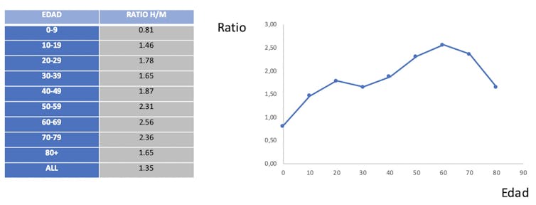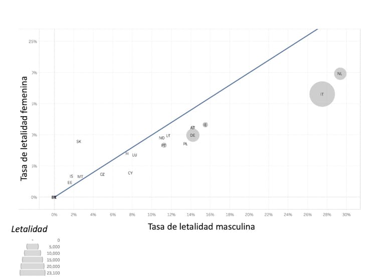 Se observa que, a partir de los 15 años, los hombres tienen claramente las de perder. En un estudio realizado a partir de datos en todos los países europeos se corrobora esta tendencia. En la figura 2 está representada la tasa de letalidad en mayores de 60 años de hombres frente a mujeres en Europa. Los valores por debajo de la diagonal indican que la tasa de letalidad de los hombres es mayor a la media de todos los países, con la excepción de Chipre y Eslovaquia.